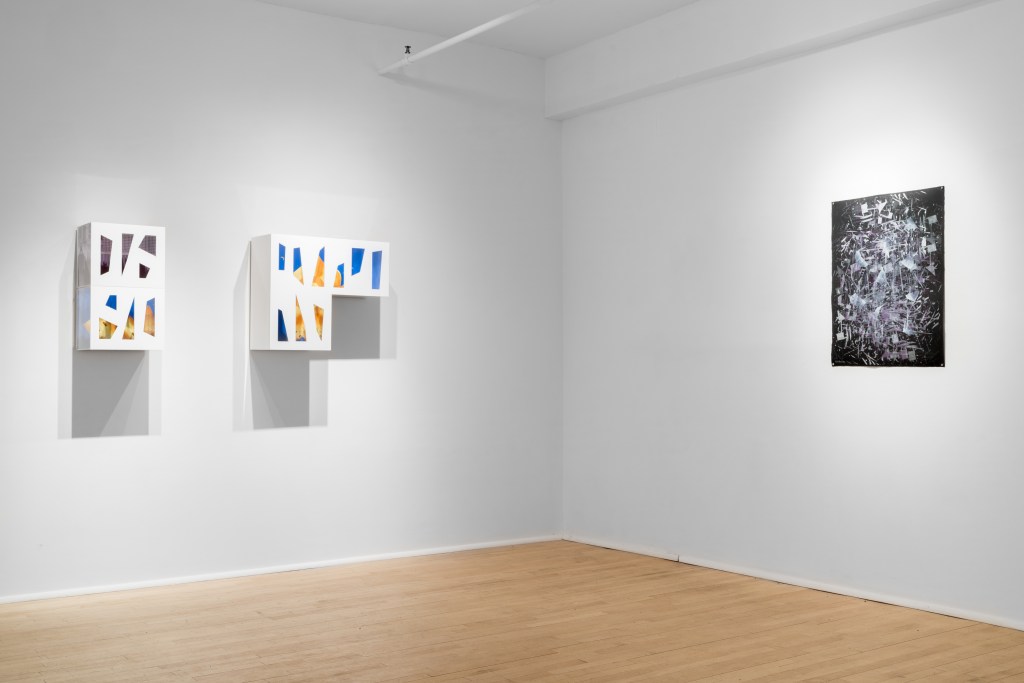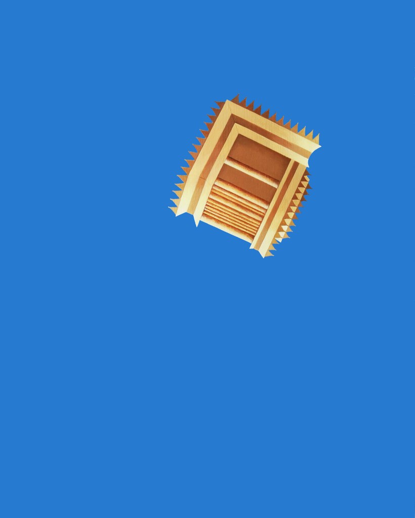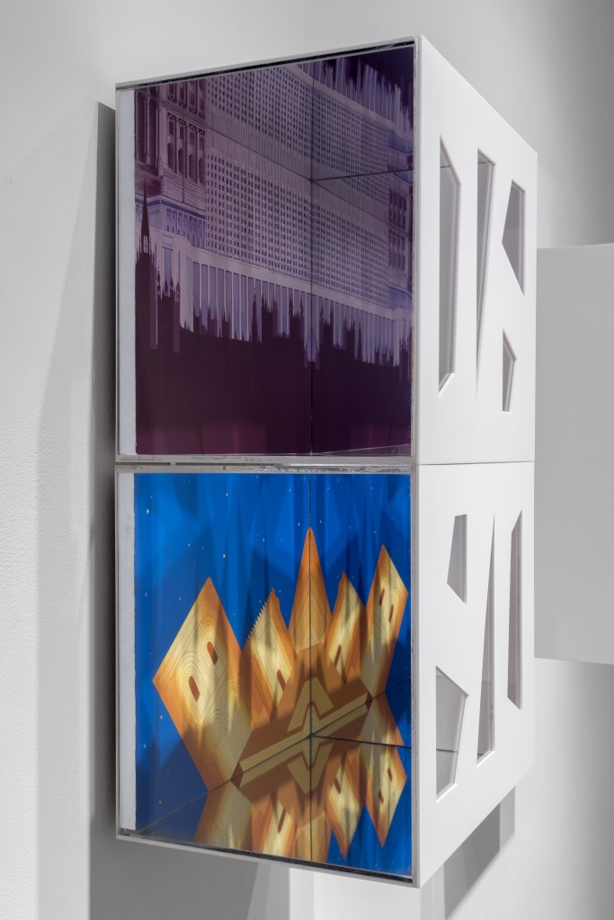 Au sein des images bidimensionnelles de Taheri, les caractéristiques abstraites des trois structures religieuses se côtoient et se superposent. Ces images composites, obtenues grâce au procédé photolithographique, sont insérées dans quatre boites-présentoirs : deux grandes et deux petites, chacune percée d’une multitude d’ouvertures. L’intégralité des images ne peut être embrassée par le visiteur d’un seul coup d’œil. Plutôt, le visiteur les découvre par fragments, en multipliant les points de vue. Bien que Bahar Taheri ait utilisé la stratégie de la boite fenestrée dans des travaux antérieurs, elle aborde les fenêtres différemment dans cet ensemble. En effet, l’artiste s’est ici inspirée des travaux d’architectes juifs contemporains, tels ceux de Daniel Liebeskin pour le Musée juif de Berlin, afin de développer des fenêtres aux angles irréguliers.
