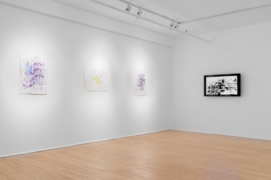 La composante vidéo au sein de l’exposition s’ouvre sur une présentation kaléidoscopique de centaines d’éléments graphiques, de fragments d’images flottant dans un espace blanc. Peu à peu, ces « débris » visuels se rassemblent dans des ensembles de plus en plus cohérents, pour finalement s’agencer et donner forme aux trois architectures de Jérusalem : la mosquée, l’église, le temple. Rapidement, toutefois, les images commencent à se morceler, semblant répondre d’un mouvement interne, se désintégrant de nouveau en centaines d’éclats. Ici, la danse cyclique de la déformation et de la reformation s’appuie sur une trame sonore présentant la dynamique et le paysage sonore diversifié des rues de Jérusalem. La corne juive de Shofar, les cloches d’une église chrétienne et l’appel à la prière musulmane se font entendre, entrecoupés des bruits ambiants de la rue, des conversations et des interactions entre les passants.